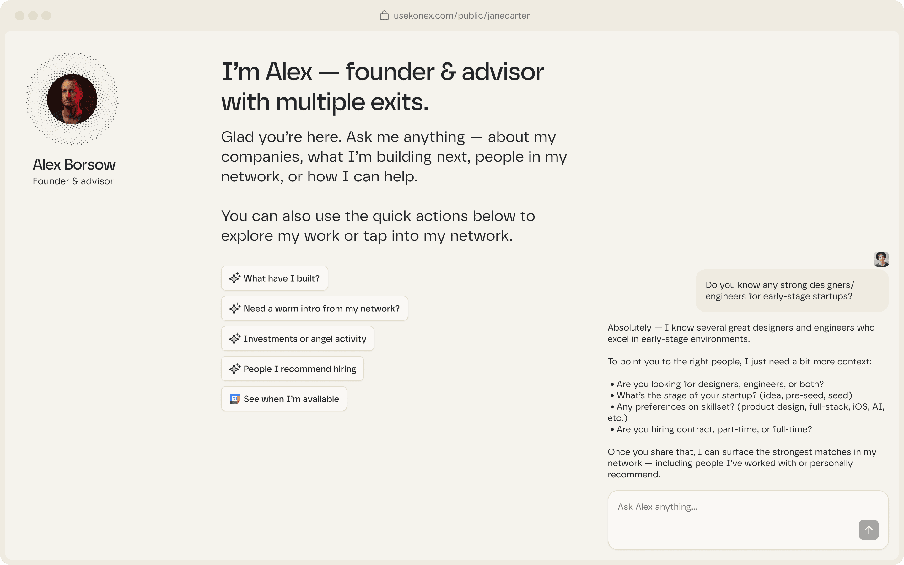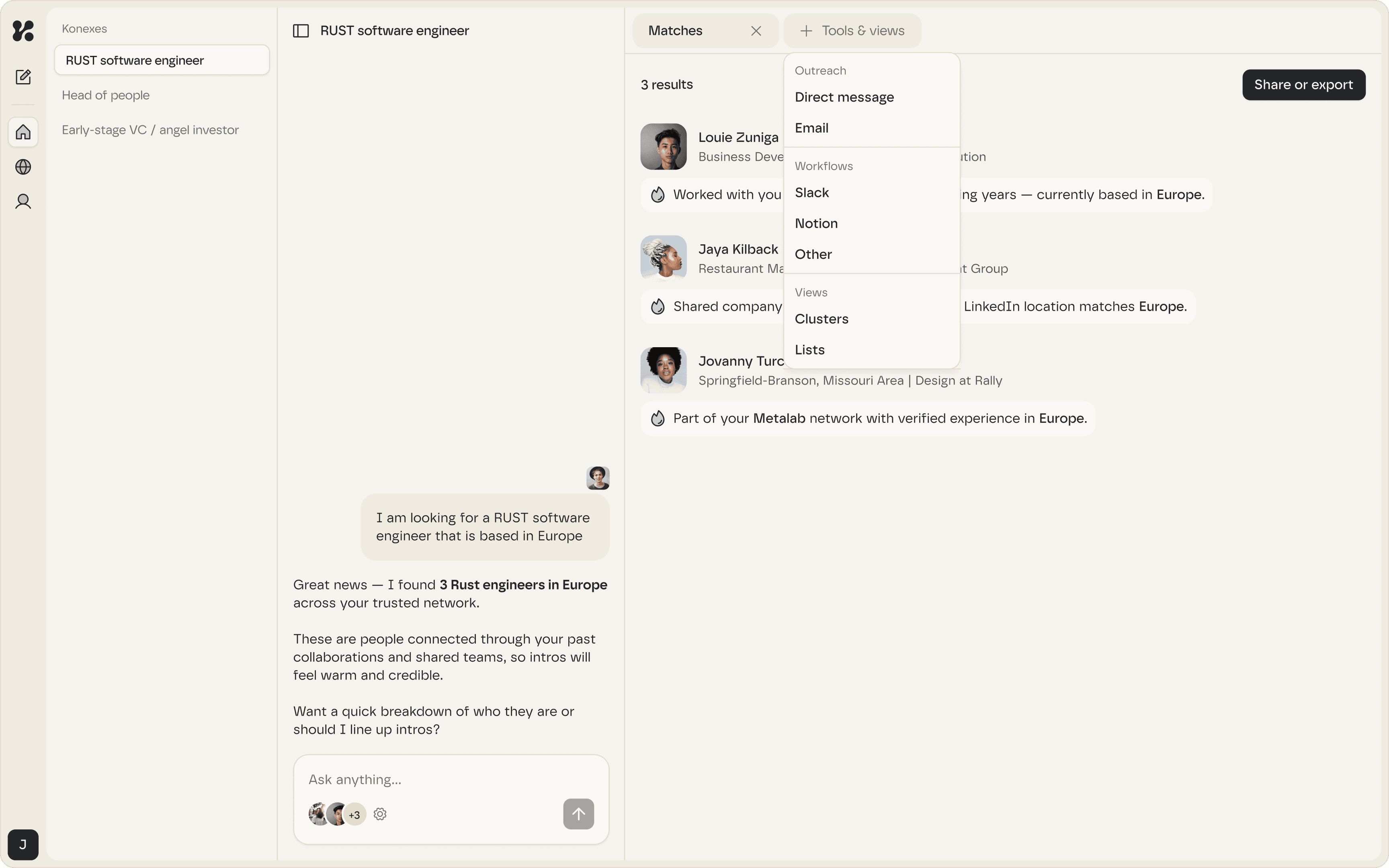 Type what you need and Konex reveals the right people and the warmest intro paths.